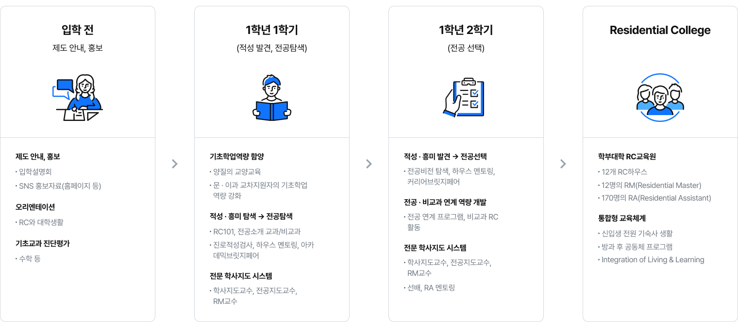 - 기초학업역량 강화를 위한 양질의 교양기초, 대학교양 및 전공탐색을 위한 RC101, 아카데믹 브릿지 페어, 커리어 브릿지 페어와 각종 RC프로그램 등 다양한 교과 및 비교과 프로그램이 제공된다.
